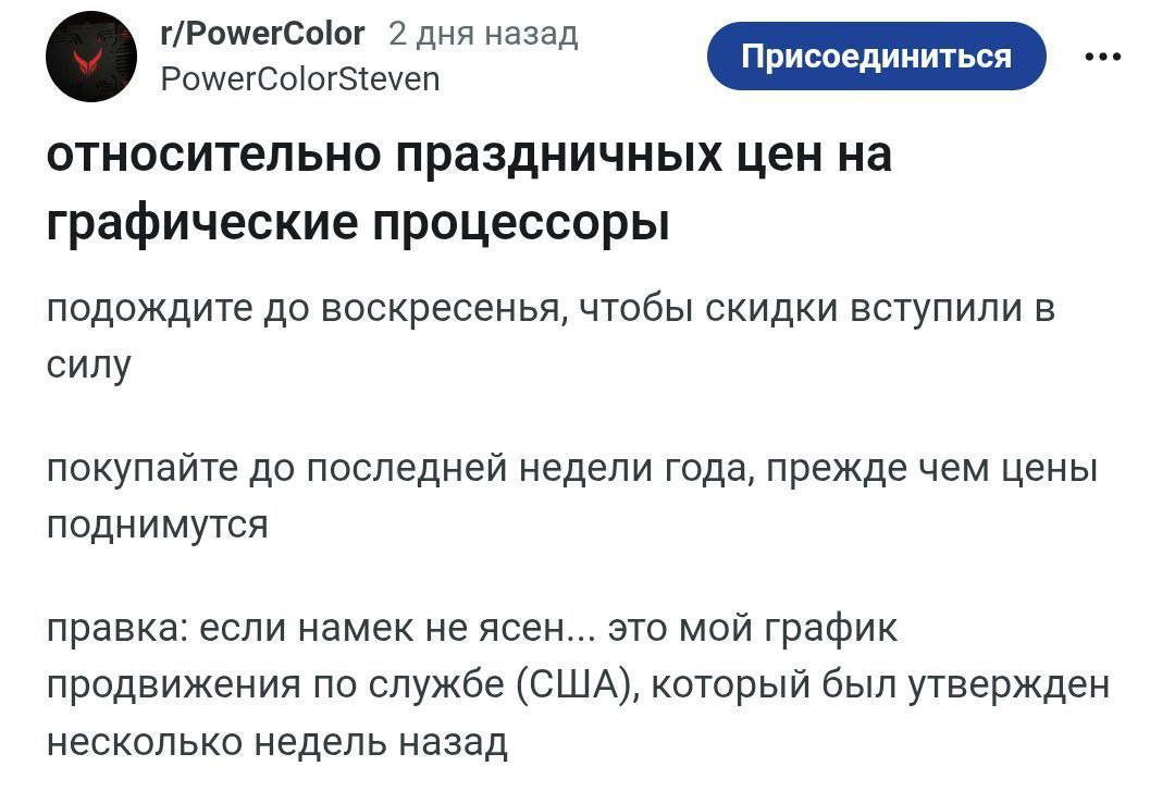 Об этом заявил представитель тайваньского бренда видеокарт Powercolor на Reddit. Потом цены могут подняться в ДВА РАЗА. Это связано с сезонным спросом и логистическими проблемами, ожидающимися в преддверии праздников.
