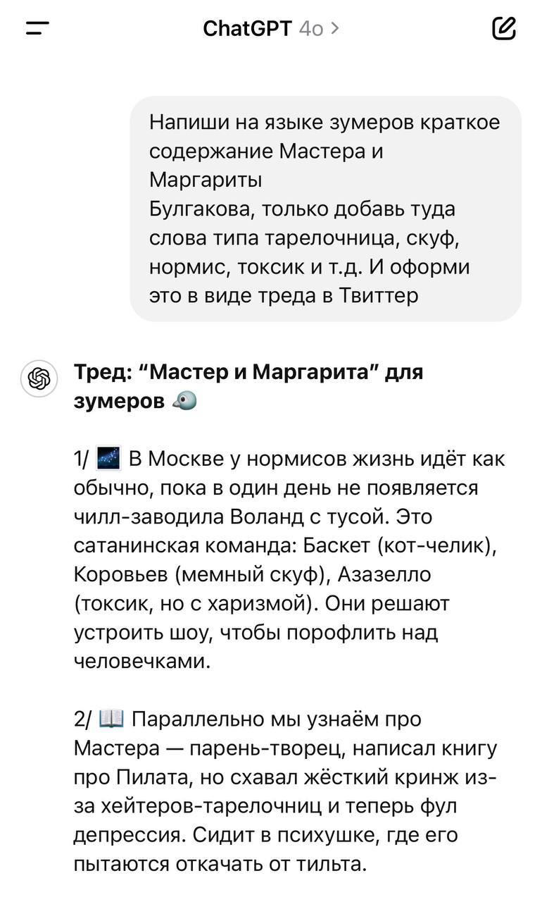 📚 Зумерское объяснение русской классики от ChatGPT как отдельный вид искусства Спидран по персонажам «Мастера и Маргариты»: Воланд — чилл-заводила Баскет — кот-челик Коровьев — мемный скуф Азазелло — харизматичный токсик Мастер — парень-творец с фулл депрессией, которого откачивают от тильта в психушке Маргарита — просто топовая вайфу У тех, кто прогуливал литературу, сейчас может появиться желание прочитать роман. 📚 Зумерское объяснение русской классики от ChatGPT как отдельный вид искусства Спидран по персонажам «Мастера и Маргариты»: Воланд — чилл-заводила, воплощение абсолютного зла, но с долей иронии. Подробнее о Воланде Баскет — кот-челик, хулиган и любитель розыгрышей, который мгновенно покоряет публику. Коровьев — мемный скуф, хитрый и саркастичный помощник Воланда, олицетворяющий хитрость и обман. Азазелло — харизматичный токсик, демон-убийца с демонической привлекательностью и жестокостью. Мастер — парень-творец с фулл депрессией, которого откачивают от тильта в психушке, измученный творчеством и непониманием. Маргарита — просто топовая вайфу, готовая на все ради любви, символ преданности и самоотверженности. Такой подход, использующий молодежный сленг и мемы, позволяет по-новому взглянуть на сложные образы русской классики. ChatGPT, анализируя запросы пользователей, адаптирует сложные литературные произведения для зумеров, делая их понятными и интересными. Это не просто пересказ, а креативная интерпретация, которая вызывает любопытство и желание узнать больше. Например, описание Мастера как «парня-творца с фулл депрессией» мгновенно передает его состояние, а «вайфу» для Маргариты подчеркивает ее значимость. У тех, кто прогуливал литературу, сейчас может появиться желание прочитать роман. Get Your Free Consultation! ПОЛУЧИТЕ БОНУСЫ ОТ ЛУЧШИХ ЛИЦЕНЗИОННЫХ ОНЛАЙН КАЗИНО ЗДЕСЬ Навигация по записям Бесплатное IT-обучение для граждан РФ: Получите сертификат! Миссия NASA на Луну отложена: Новые сроки